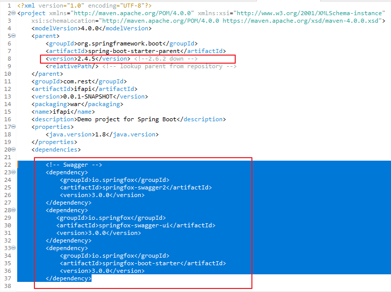 여기서 Spring boot 버전을 수정하는 이유는 swagger-ui 를 사용하려고 하는데... maven install 하면 오류가 발생하여 어쩔 수 없이 버전을 다운하였음. 아래 화면처럼 pom.xml 수정 변경함.