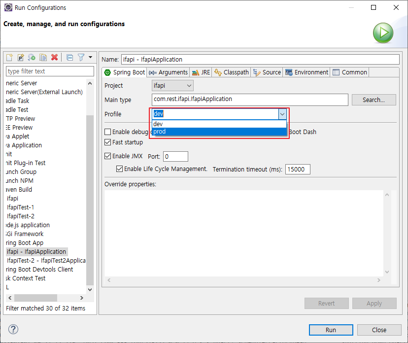 이제 run configurations에서 실행을 할때 선택을 하여 실행하면 됩니다.