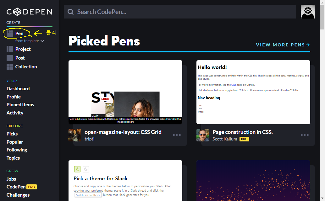 우선 CodePen 사이트에 가입을해야 사용이 가능합니다.