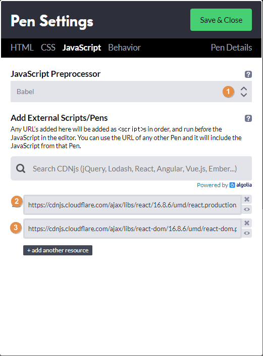 2) Add External Scripts/Pens에서 다음의 두가지 주소를 등록합니다.