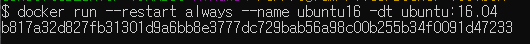$ docker run --restart always --name [컨테이너이름] -dt ubuntu:16.04 나의 경우는 아래처럼 컨테이름 붙여서 실행함 $ docker run --restart always --name ubuntu16 -dt ubuntu:16.04 여기서 중요한 옵션설명 -dt d는 백그라운드에서 실행시켜주고, t는 pseudo-TTY를 사용한다. |