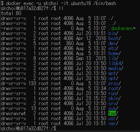 | $ docker exec -u skchoi -it ubuntu16 /bin/bash |