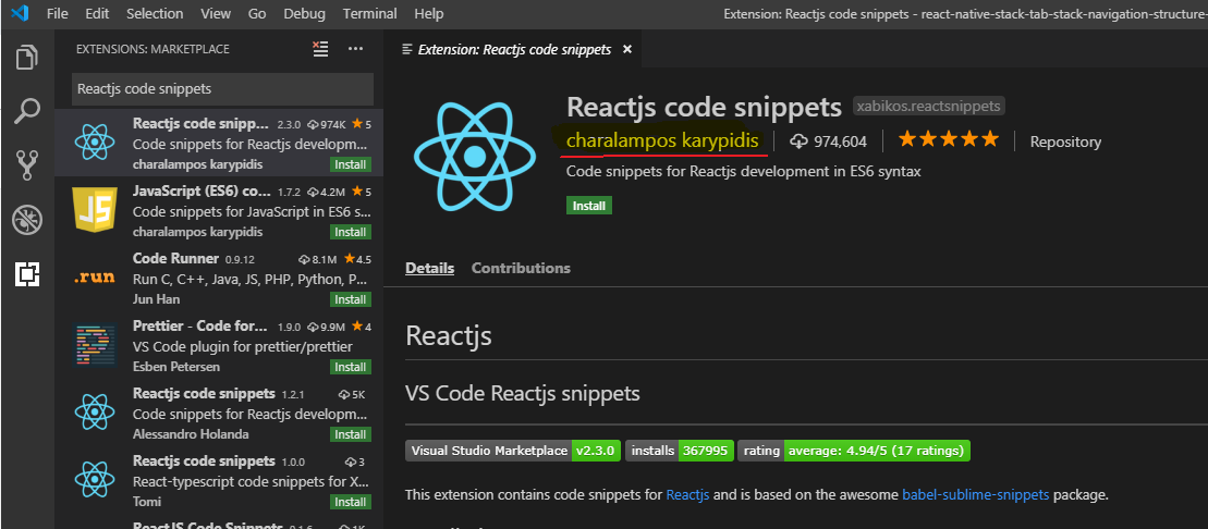 4. Reactjs code snippets => 리액트 관련 스니펫 모음으로 종류가 꽤 많음.