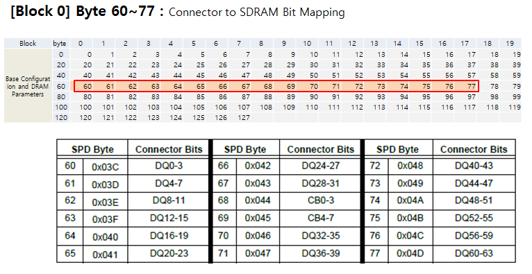 60번 BYTE에는 DQ0, DQ1, DQ2, DQ3 에 대한 매핑정보를 표시한다. 이렇게 77번 BYTE 까지 모듈 핀정보의 DATA INPUT/OUTPUT 구성정보를 표현한다. 총 18개의 BYTE 로 4개 INPUT 4개의 OUT PUT이 되는것 같다. 내가 맞는지 모르겠지만 72 PIN 정보 일 것 같다.