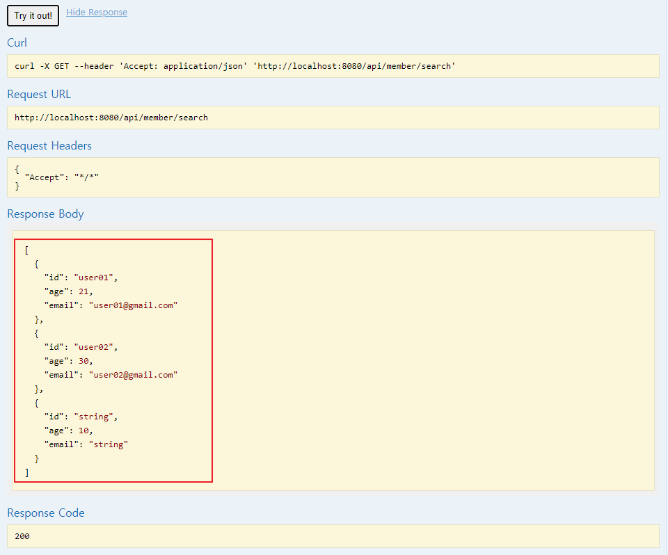 /api/member/search 하여 사용자 조회를 한번 해봅니다.