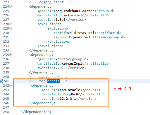3) 본인은 오라클을 사용하였음. 그래서 pom.xml에 오라클을 등록함