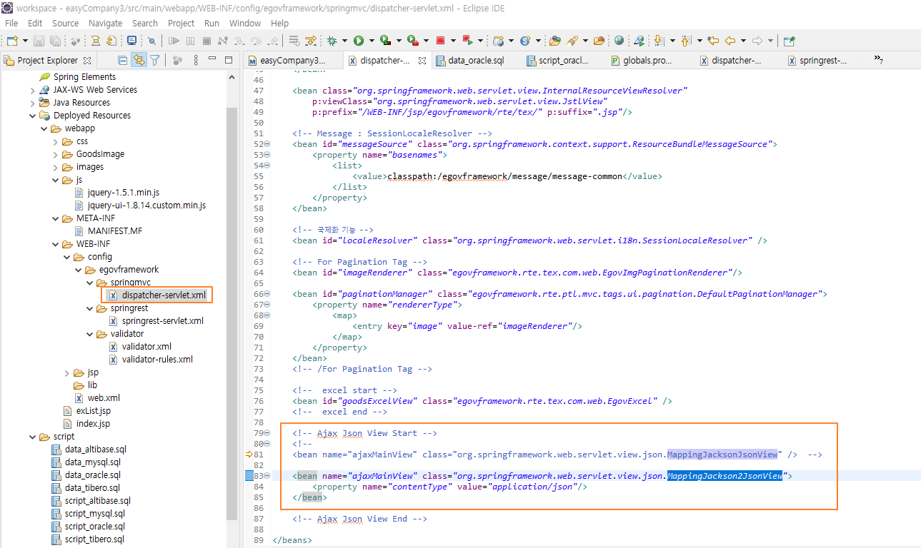 한군데 더 수정해야 함. springrest-servlet.xml 이 파일에서도 수정요망.