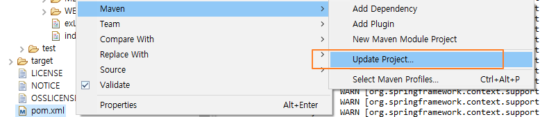 4) 이제 pom.xml 을 Update Project 를 실행하고 maven install 다시 한번 실행