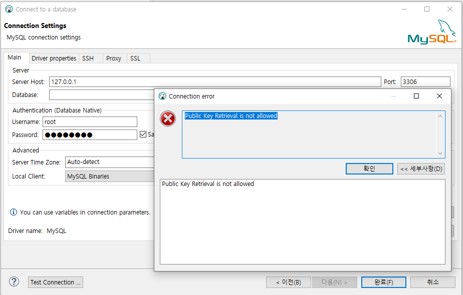 allowPublicKeyRetrieval 이 부분을 true로 수정변경