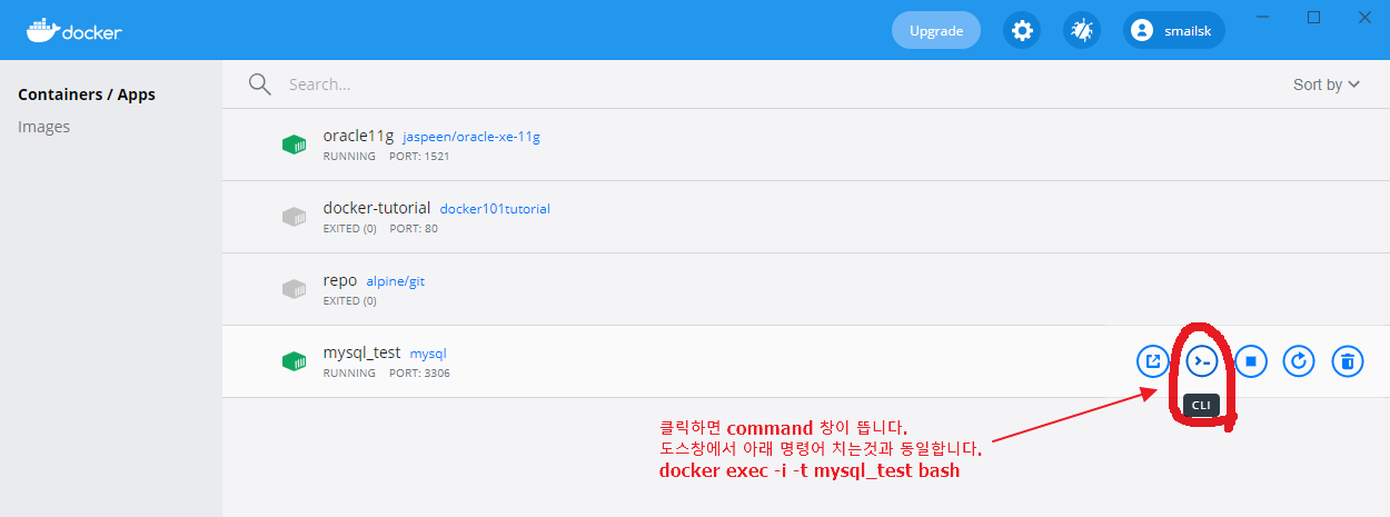 ###개발환경Windows 10 pro, Docker for Windwos Docker에 mysql 설치하기일단 docker의 kitematic을 열고 Docker CLI를 클릭하여 윈도우 파워쉘을 열고 Docker 명령어로 진행하겠다.(GUI를 사용할수도 있지만, 나는 터미
