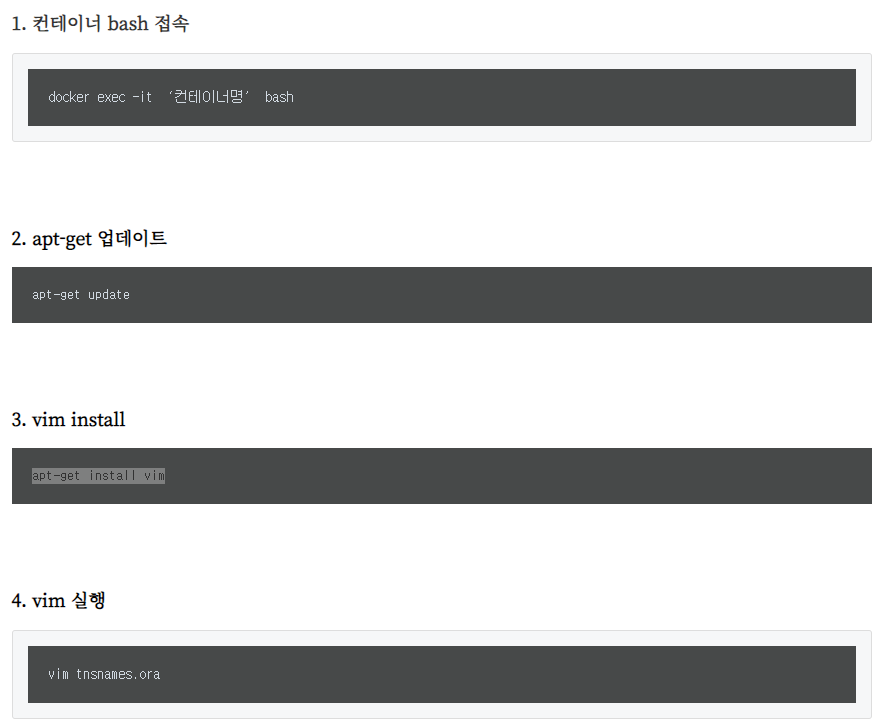 이번에 도커에 오라클을 설치하여 개발환경을 구축하고 있다. tnsnames.ora 를 수정하려고 하는데 vi 명령어가 동작하지 않는다. 기본적으로 설치되어있지 않은것같아서 별도로 설치해보았다. 1. 컨