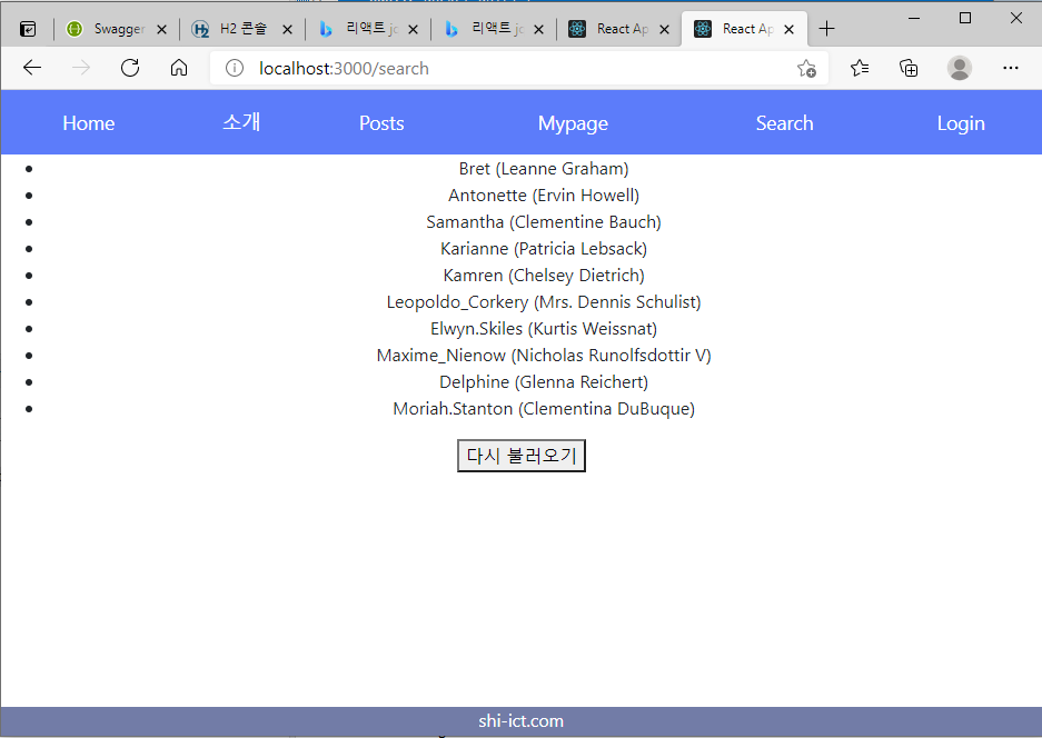 그래서 여기서 React API 연동 관련하여 공부가 필요합니다. 그래서 다시 테스트 연습할 수 있는 사이트를 확인하여 먼저 테스트를 해봅니다. 이 사이트의 예제를 제 react 데모 프로젝트에 집어 넣어서 구현 테스트를 해봅니다.
