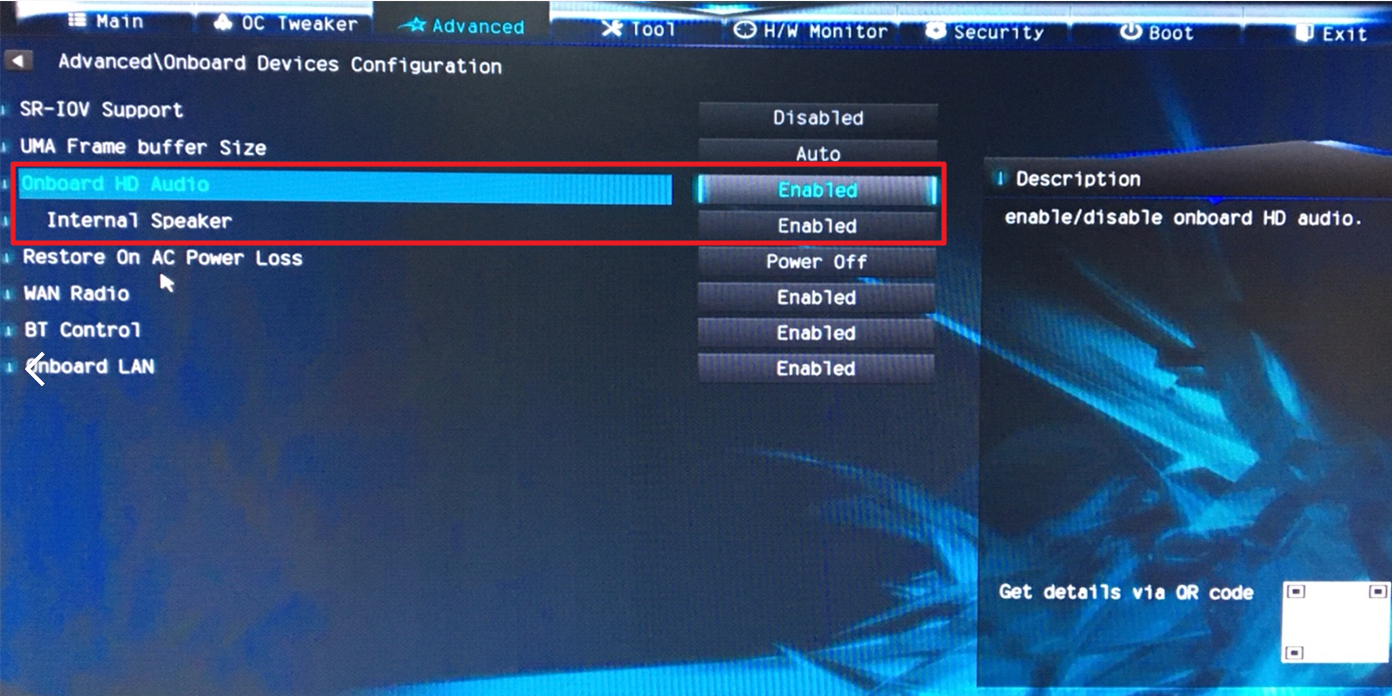 해결은 아래와 같이 두개를 모두 enable 하려 해결되었음. 처음에는 Onboard HD Audio 만 enable / disable 해보고 하였는데...