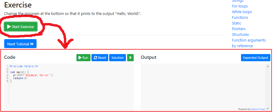 Start Exercise 버튼을 클릭하면 웹에서 코드를 타이핑하고 바로 결과를 확인할 수 있습니다.